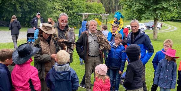 Die Falkner Michael Schmidt mit seiner Partnerin Dagmar Kramer aus Niedersfeld und Jo Geilen aus Nuttlar waren auf Einladug der SGV Abteilung Siedlinghausen zu Besuch an der SGV-Hütte.